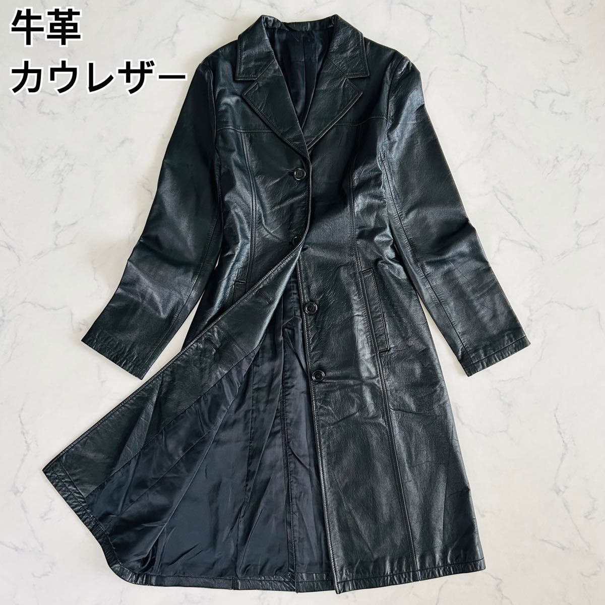 > 牛革 カウレザー トレンチコート ロングコート アウター シングル Y2K オールレザー 本革 ブラック 黒 Mサイズ レディース