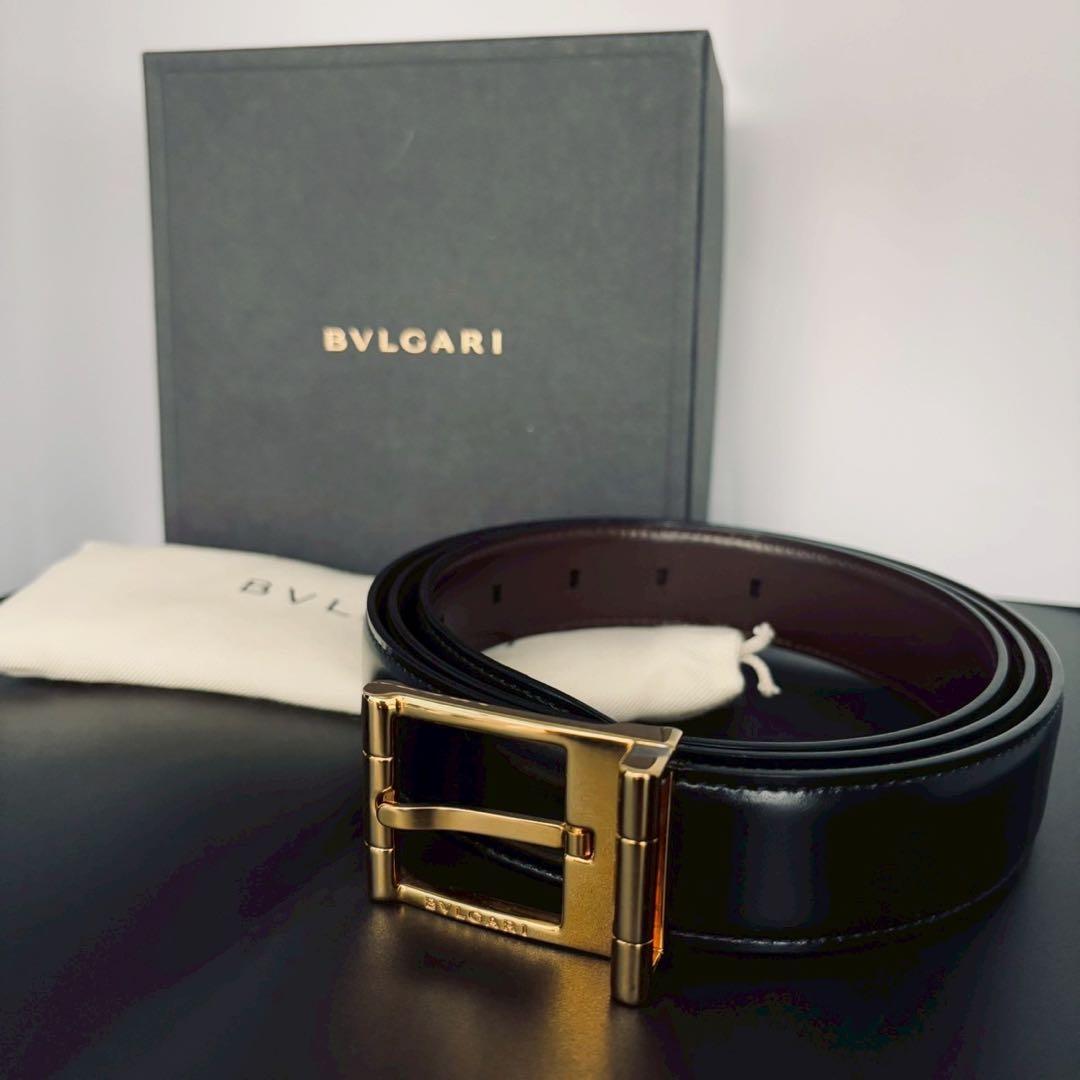 - 極美品 BVLGARI ブルガリ リバーシブル レザー ベルト ゴールド バックル ブラック ブラウン 箱付き シンプル 紳士 メンズ