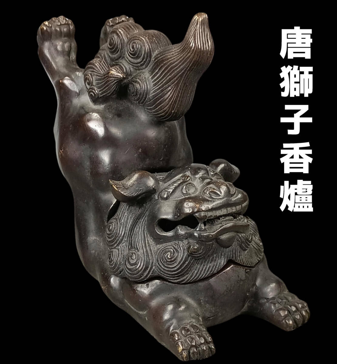 > 【偲】《中国 唐物》時代 唐獅子香炉 香道具 銅製 唐獅子香爐 古銅 古作 古玩 狛獅子 狛犬 高さ約15㌢ p-50