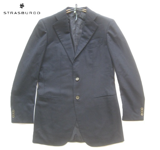 > 極上日本製!!ストラスブルゴ STRASBURGO*英国製生地 ストライプ柄ウール段返り3つボタンジャケット 44 実寸M 濃紺×灰 トラッド アイビー
