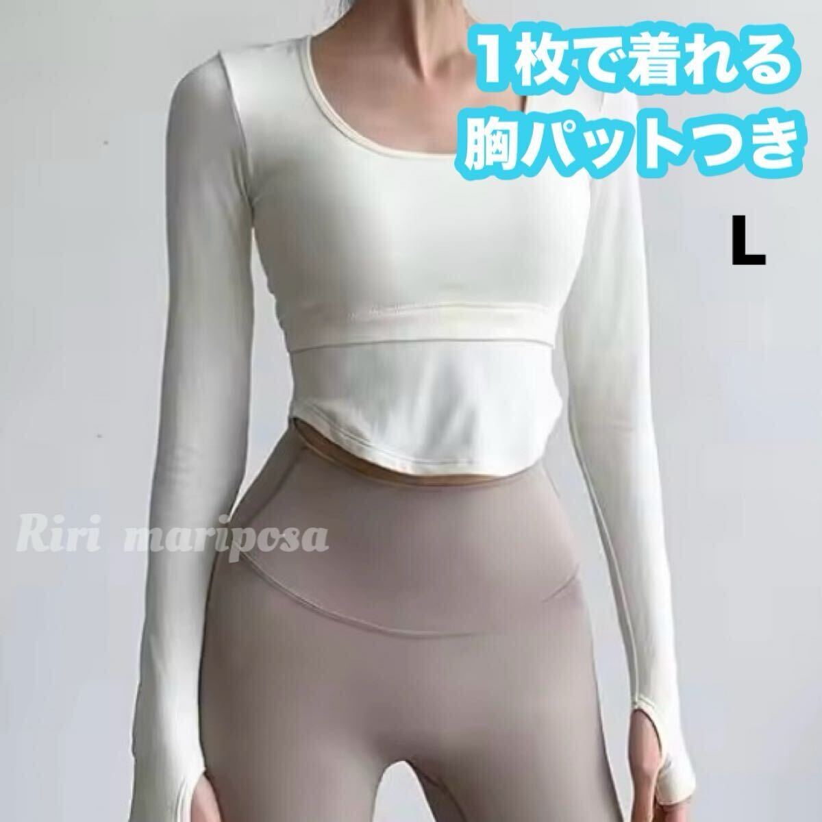 - 足長効果バツグン!長袖ヨガトップス 白L Lサイズ リブ編みカットソー ヨガウェア
