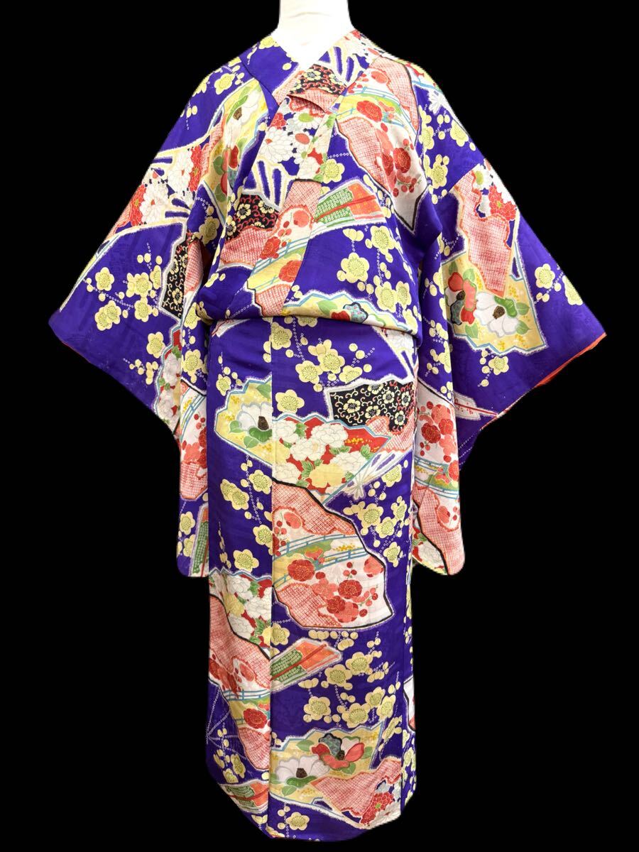 > アンティーク着物◆梅 椿 紋綸子 小紋 錦紗 大正ロマン 正絹 古布 古裂 きものさらさ奈良店