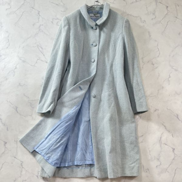 - 美品 アンゴラ混 クレージュ ツイードチェスターコート ロングコート ロゴボタン くるみボタン レディースL 水色 ブルー Courreges B1559