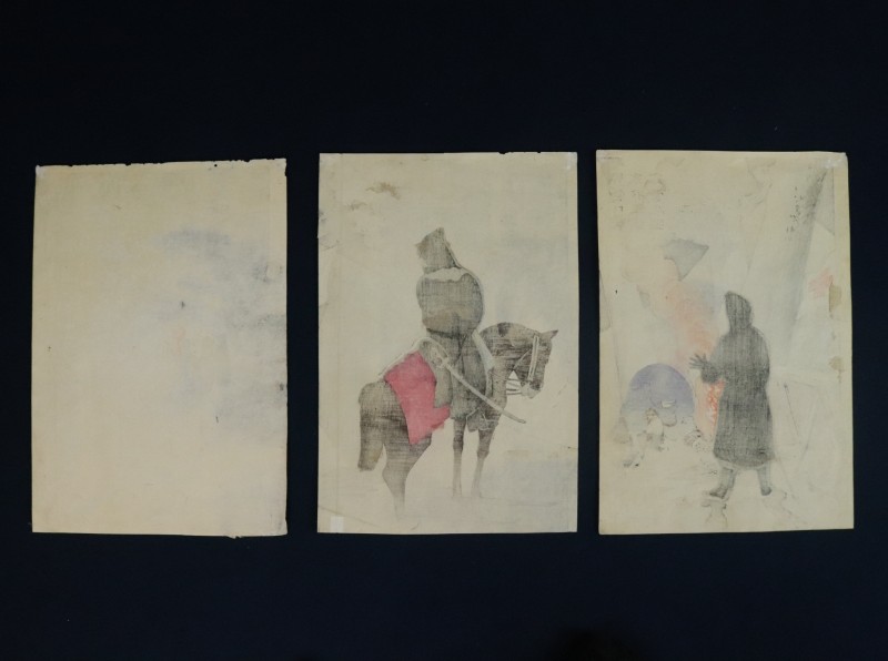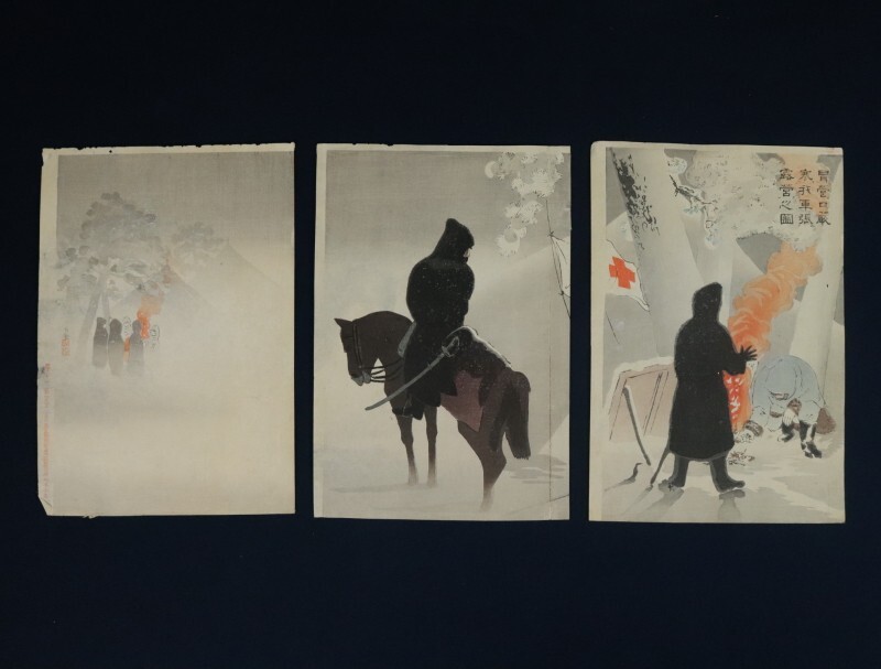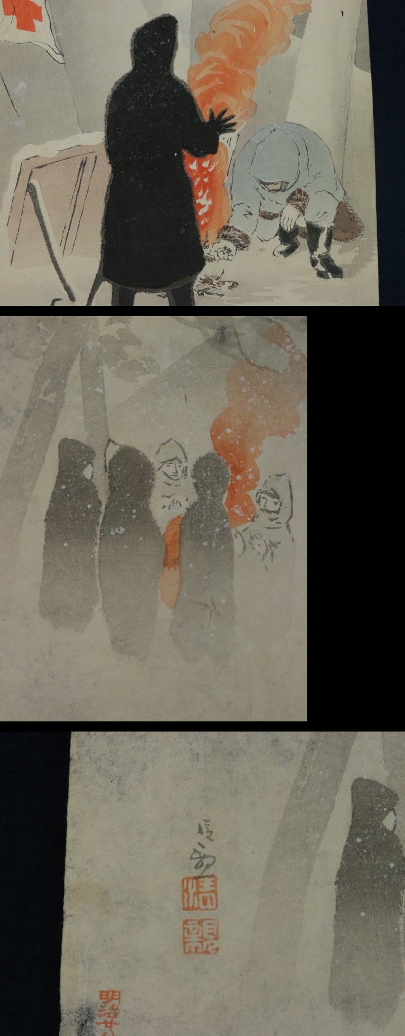 > 11111■【真作】小林清親 三枚続 「冒営口厳寒我軍張露営之図」 木版 日清戦争 明治浮世絵の三傑 版画家 浮世絵師 マクリ