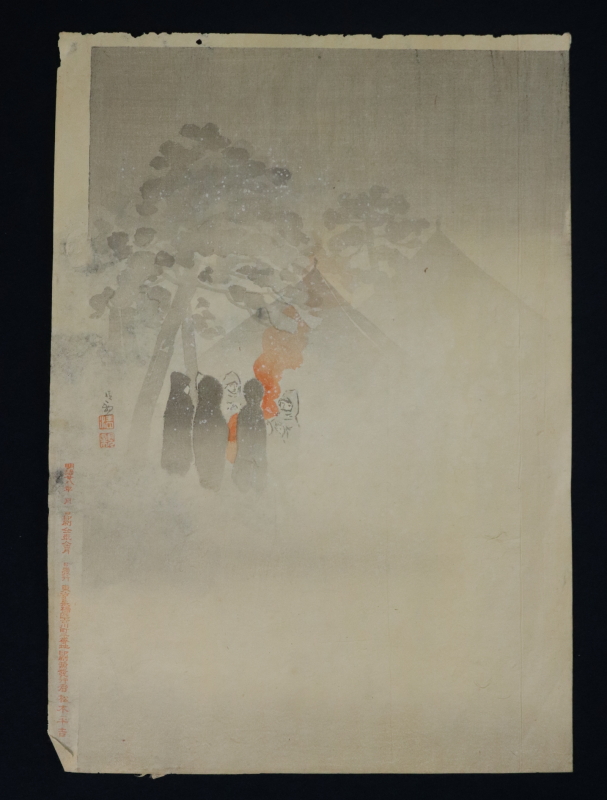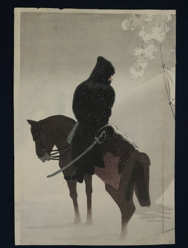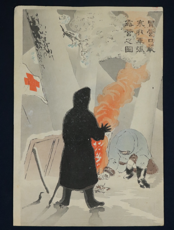 - 11111■【真作】小林清親 三枚続 「冒営口厳寒我軍張露営之図」 木版 日清戦争 明治浮世絵の三傑 版画家 浮世絵師 マクリ