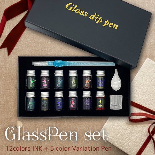 - 送料無料 ガラスペンセット インクセット 12色 一式 スターターセット ペン置き カリグラフィー文字 クリーニングカップ 万年筆 贈り物