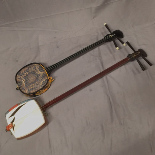 - 三線 人工皮 蛇模様 蛇柄 全長約78cm 弦楽器 他 三味線 細棹 丸打胴 全長約96cm 日本楽器 伝統楽器 計2点 現状品