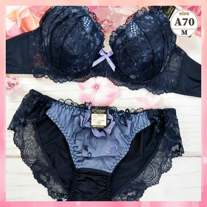 > Za7042◆新品 ブラショーツセット 【A70/M】下着 ランジェリー 丸胸 ワンポイントローズ刺繍 レース 紺