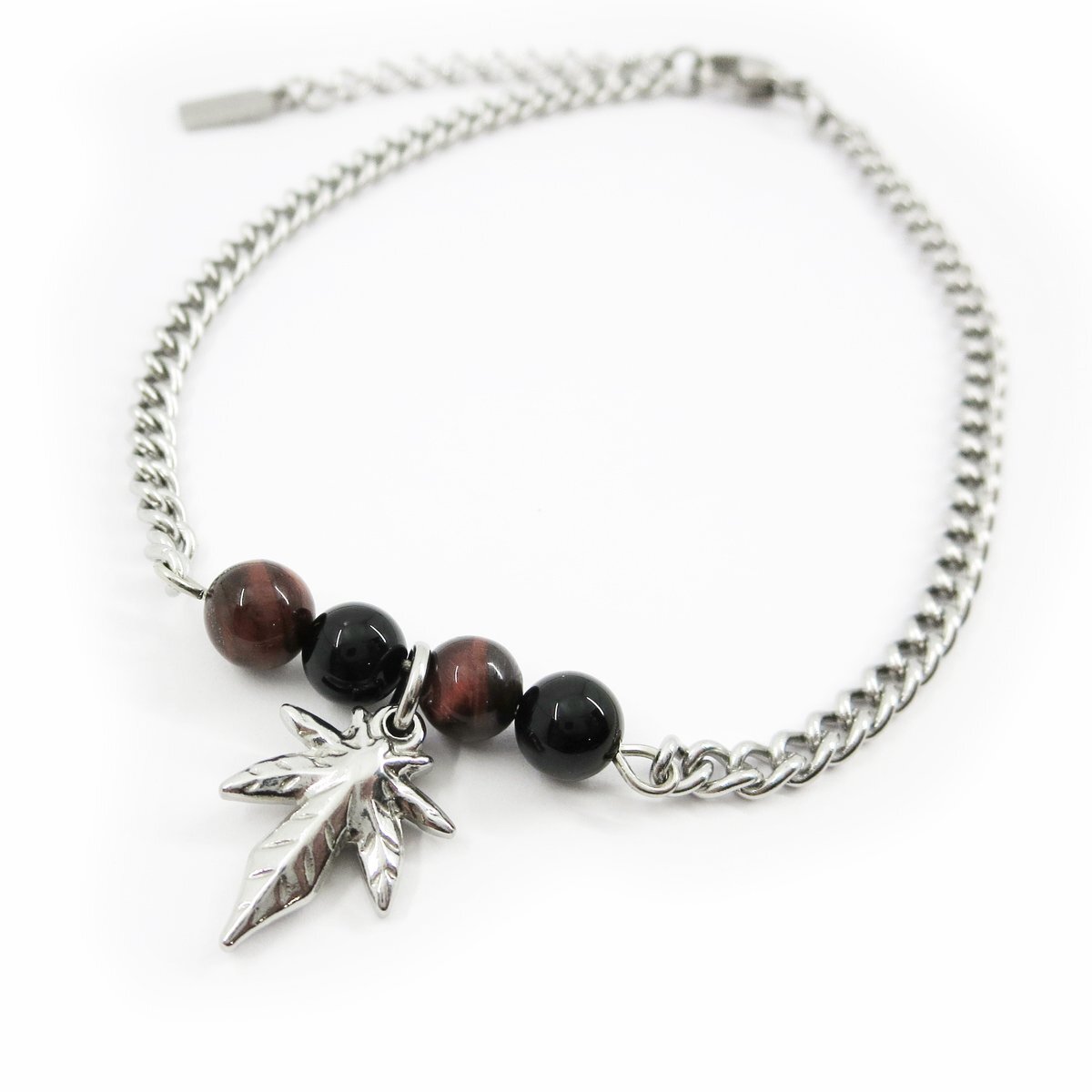 - ステンレスアンクレット レッドタイガーアイ&オニキス 約6mm マリファナチャーム チェーン幅3.5mm 27cm(23cm+4cmアジャスター) GN11