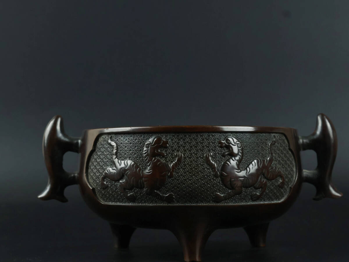 - 『館蔵珍品 紫銅製 雙獣獻瑞 魚耳爐 置物 賞物』稀少珍蔵品 古賞物 貴重物品 収蔵品 中国古美術 時代物 古董品