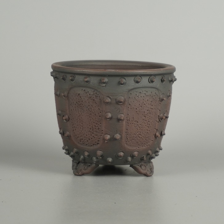- 盆栽鉢 常滑 美芸 小鉢 長辺 約 8.8cm 丸鉢 雲足 窓入 鋲打 泥物 現品