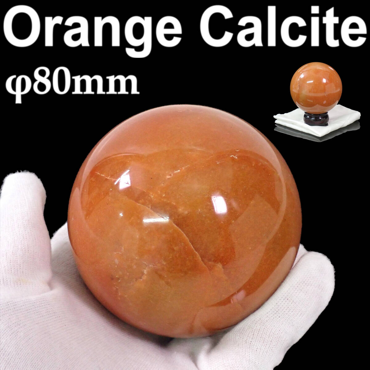 - 天然 オレンジカルサイト 丸玉 80mm 742g 木製台座付き