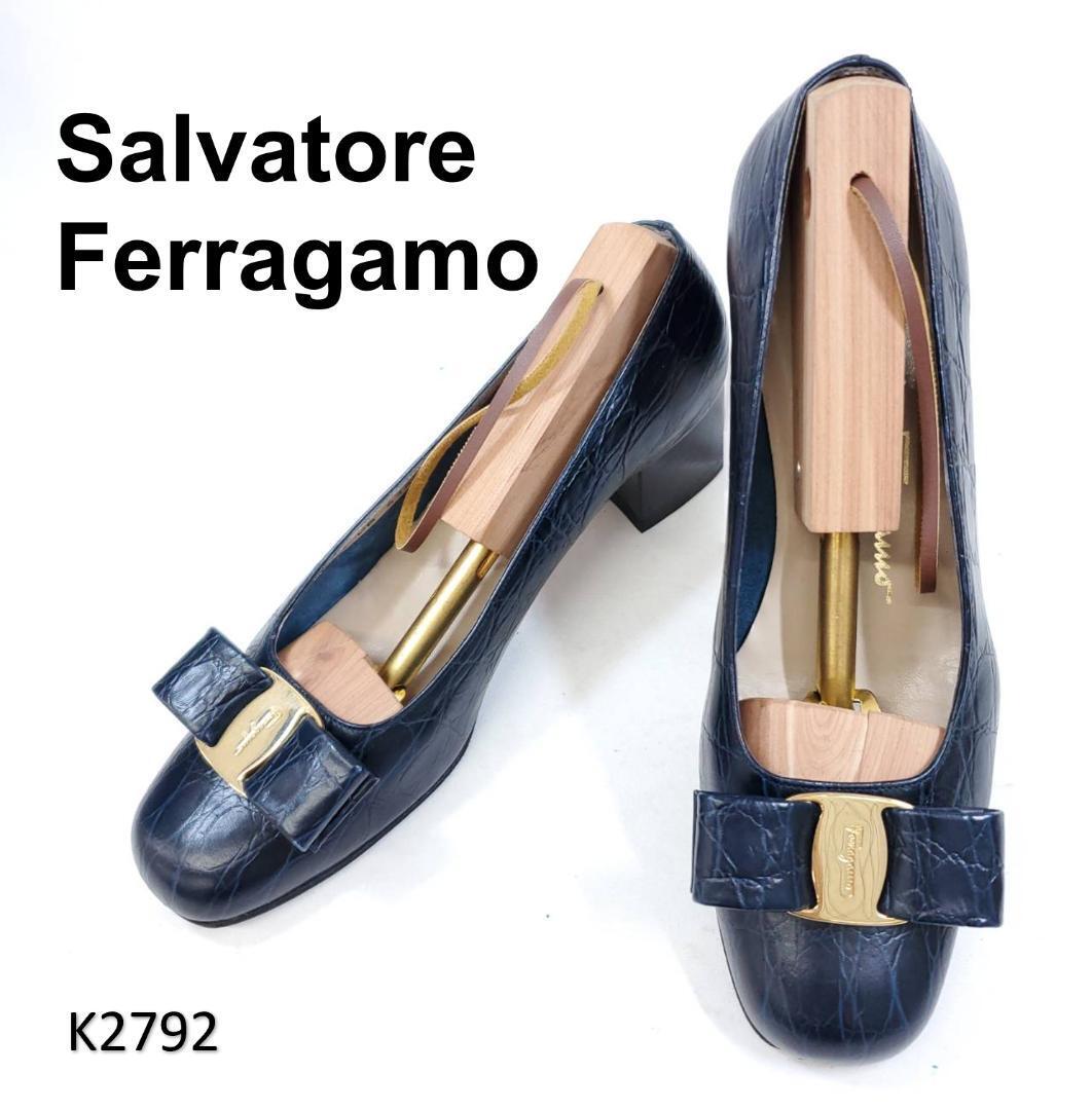 - サルヴァトーレフェラガモ 美品 ヴァラ リボン ネイビー 型押し US6