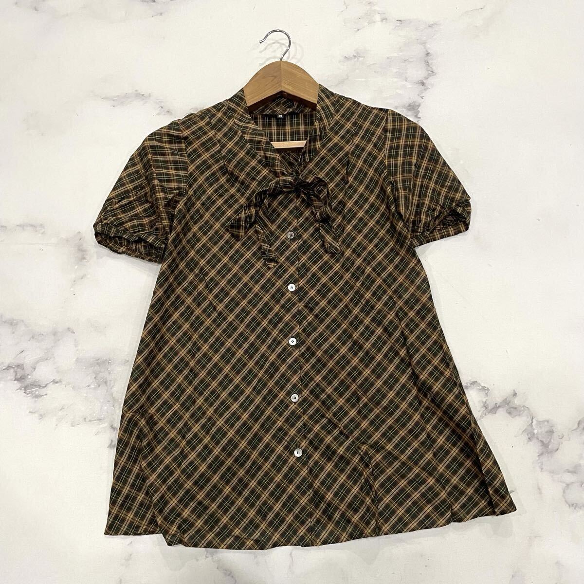 - E ○ 都会のカジュアルウェア '日本製' DAKS ダックス 半袖 チェック柄 ボウタイシャツ ブラウス size:38 レディース トップス ブラウン系
