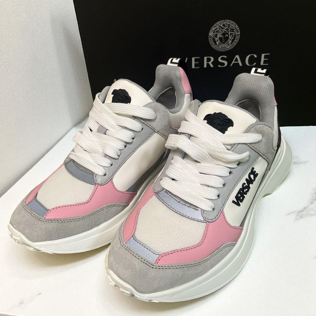 - VERSACE ロゴスニーカー 36 ピンク×グレー 箱付 23cm 靴 ヴェルサーチ