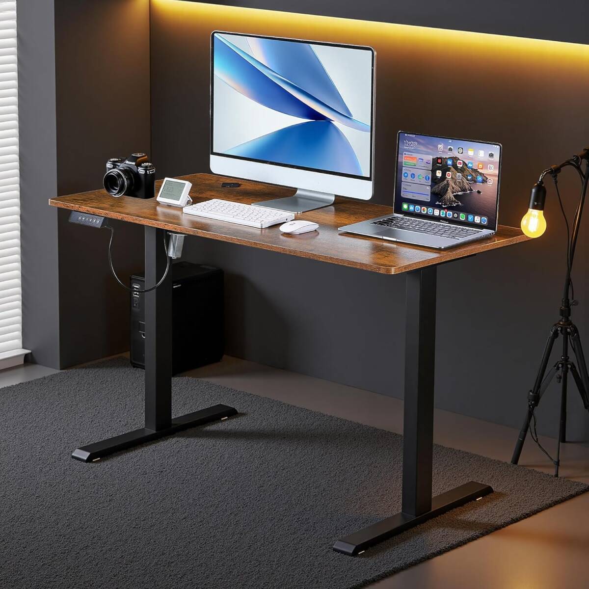 - ブラウン色 VECELO 昇降式デスク 電動 スタンディングデスク オフィスワークテーブル 幅120×奥行60 テレワーク オフィスデスク