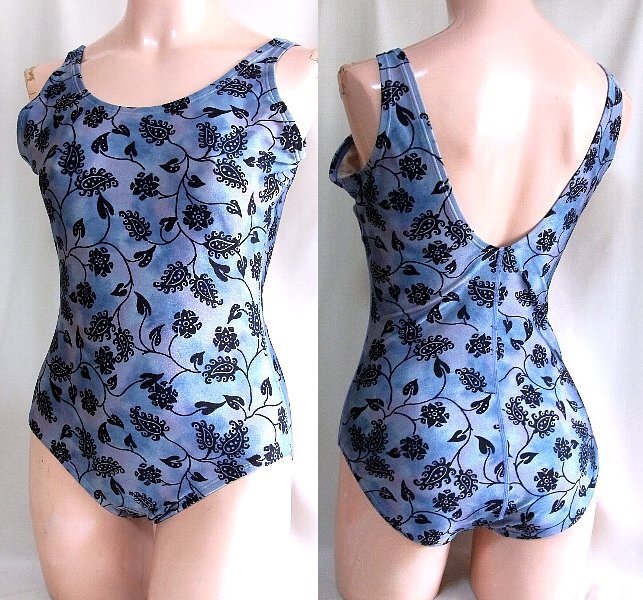 - ★☆大きめ Full Season 黒花デザイン柄ブルーグレーワンピース水着着☆★