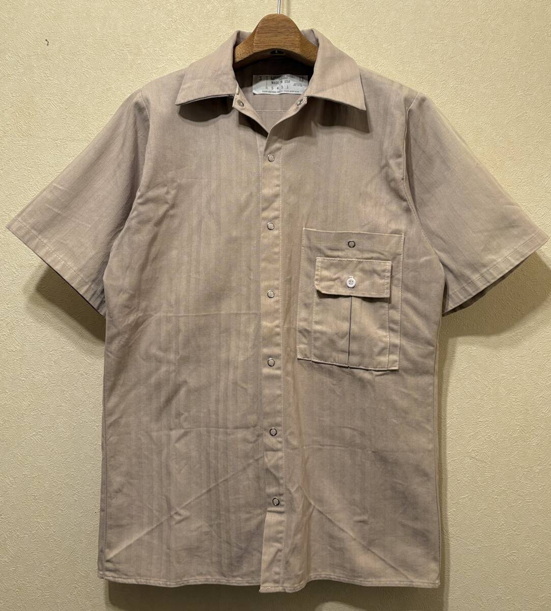 > USA製ヘリンボーン90sビンテージ希少デザイン方ポケ半袖ワークシャツSフルスナップ太HBTコットンツイル織柄カーキ系ベージュ米製US製90年代