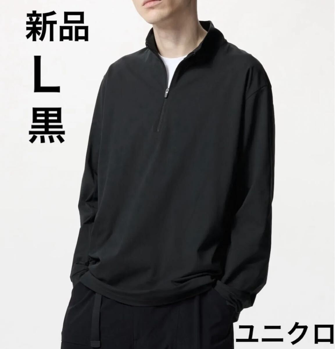 > 【新品・タグ付き】ユニクロUNIQLOドライEXUVカットハーフジップTシャツLブラック黒プルオーバー吸汗速乾トレーニング