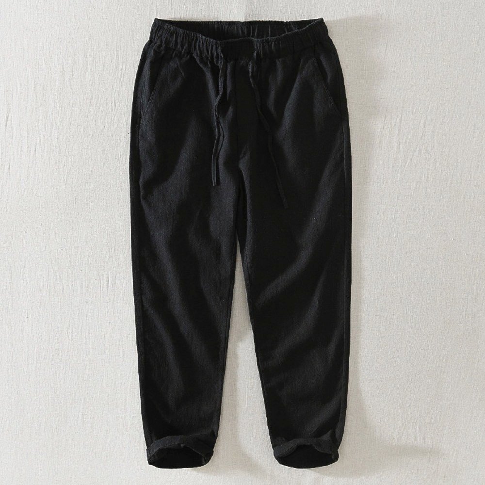 - メンズ麻綿ズボン リネンパンツ ワイド 無地 涼しい イージーパンツ チノパン ジョガーパンツ カジュアル ボトムス 9分丈 ブラック M