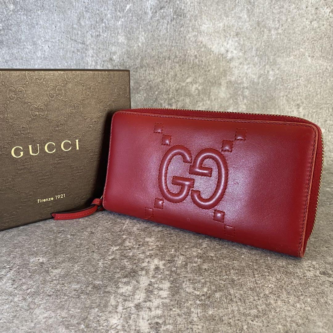 - 極美品 GUCCI グッチv長財布 GGエンボス レザー ラウンドファスナー レッド 赤