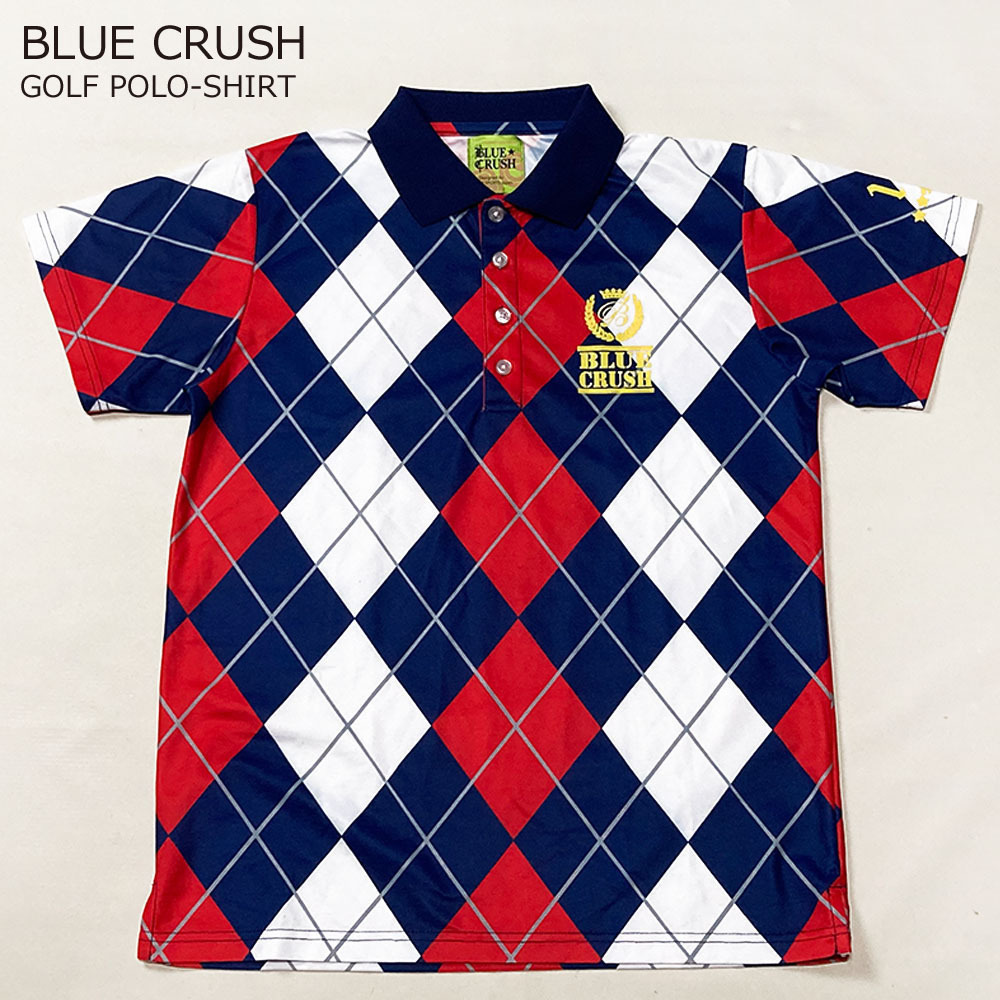 > BLUE CRUSH ブルークラッシュ 半袖 ゴルフ ポロシャツ メンズ L アーガイルチェック 速乾 ロゴプリント