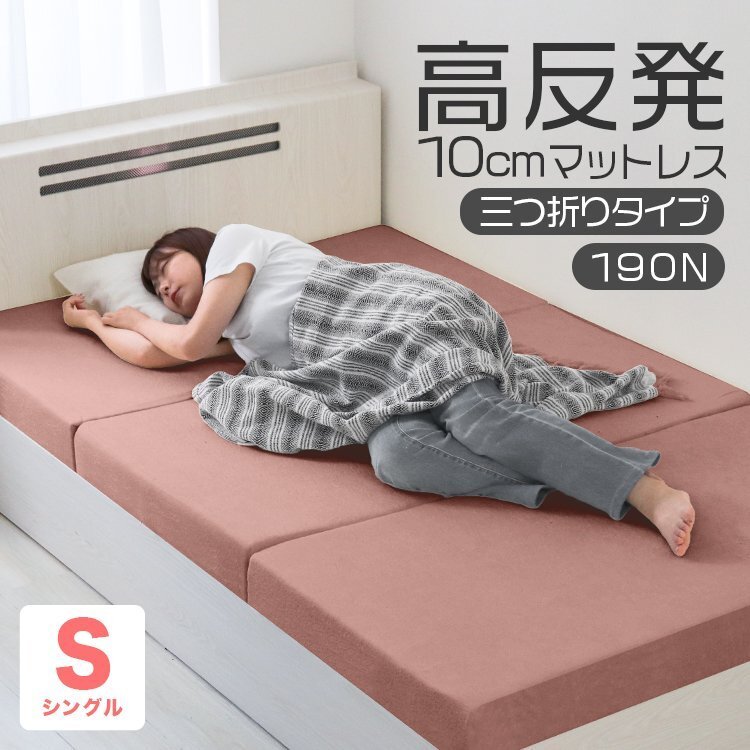 > 【アッシュピンク/シングル】高反発マットレス 三つ折り 10cm 折りたたみ マットレス 硬さ 190N 新生活 収納 コンパクト 来客 新生活 寝具