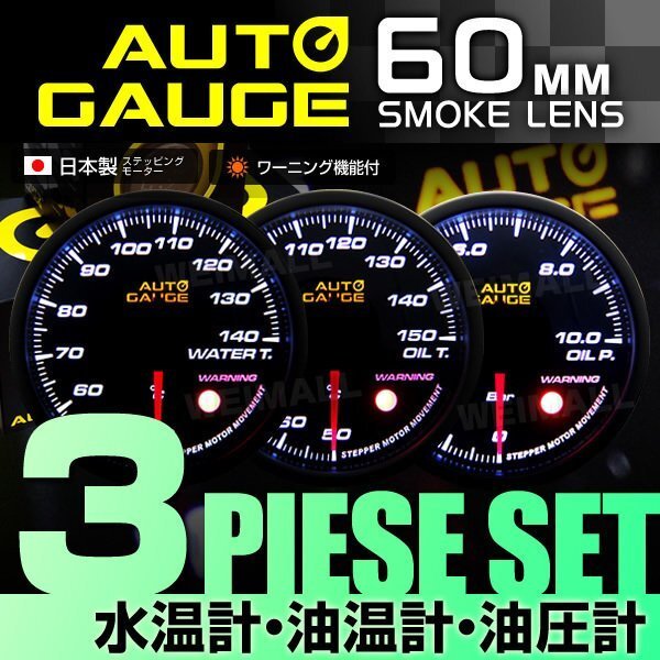 - 独占販売!オートゲージ 3点セット水温計/油温計/油圧計 60mm ワーニング 日本製モーター パーツ一式付 autoguage 360WOO 3連