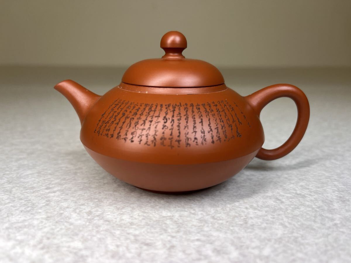 - 村田益規 益規 在銘 後手朱泥 常滑 急須 心経刻 漢詩彫 横手急須