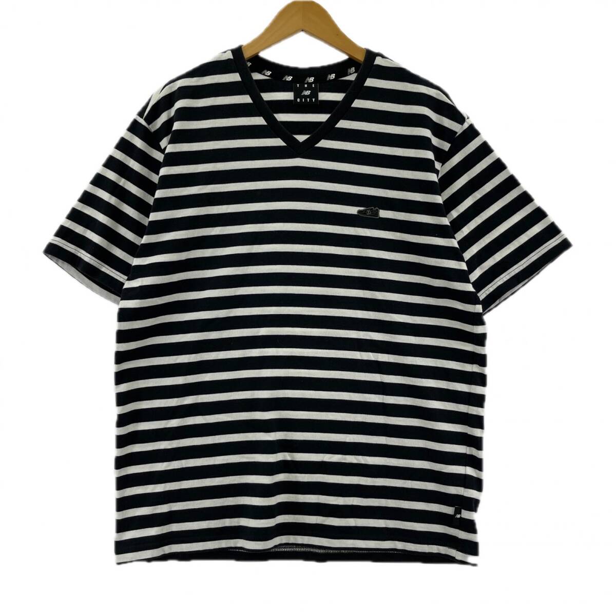 - NEW BALANCE ニューバランス ボーダー Vネック 半袖Tシャツ sizeL/ブラック×ホワイト ゆうパケットOK
