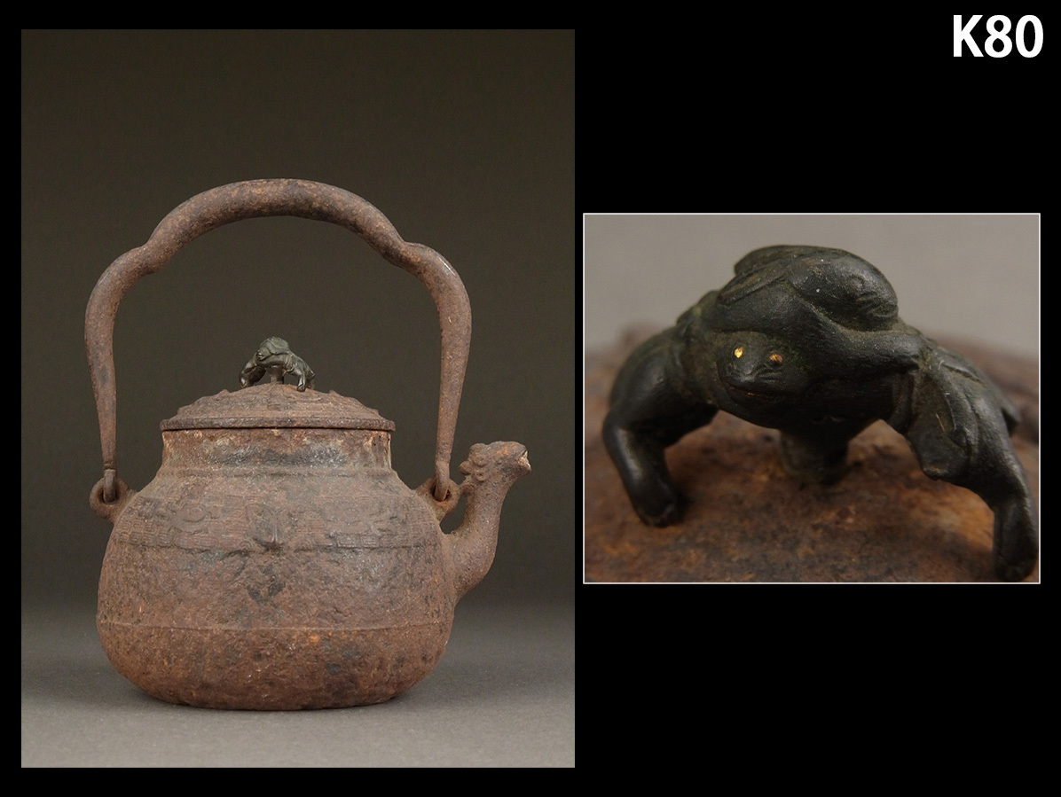 - K80☆時代煎茶道具 釜師 作家物 銀象嵌弦 兎相撲摘蓋 鳳凰口 小 鉄瓶/蔵六 鉄壺 湯沸 急須