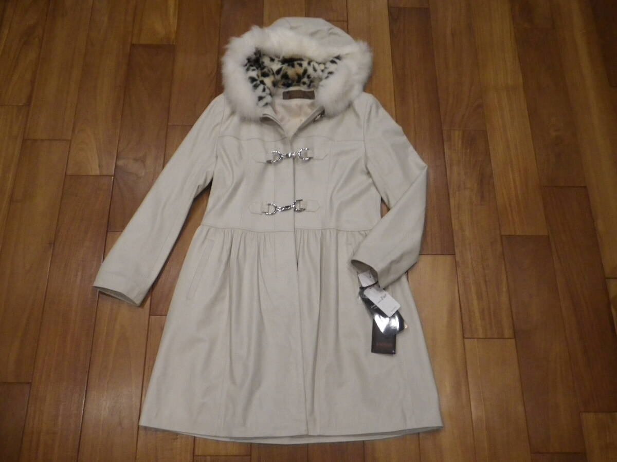 > 未使用タグ付き ピエールバルマン 羊皮 ファーフード付き ソフトレザー レディースコート サイズ9 アイボリー PIERRE BALMAIN