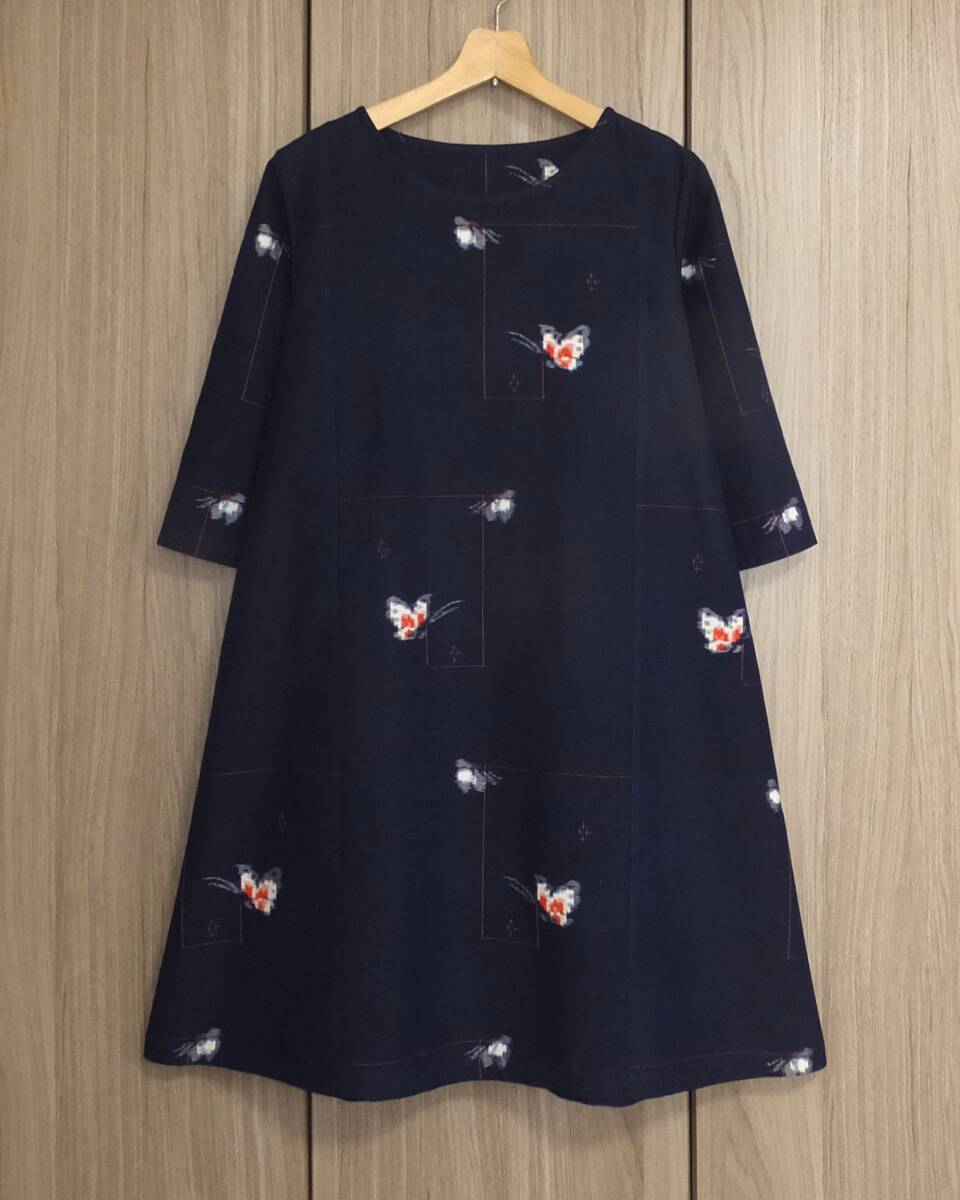- ♪送料無料 ハンドメイド 着物リメイク 古布 正絹 紬 蝶々 紺系 シンプルAラインワンピース♪