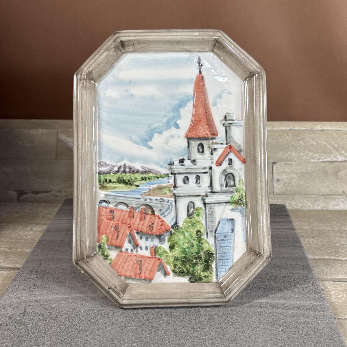 - 加藤工芸 水彩画 風景 八角形フレーム 壁掛け陶器