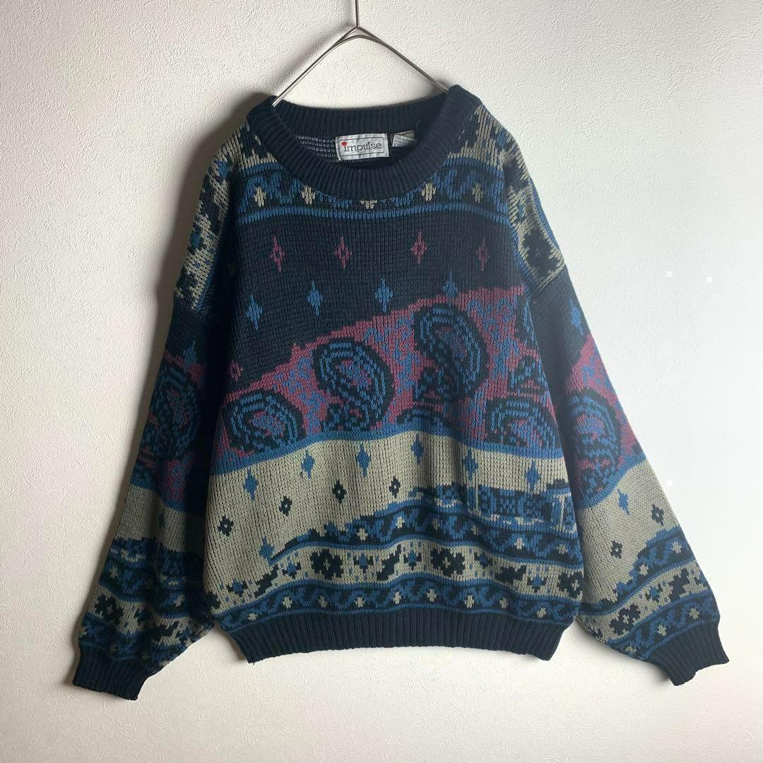 - ニット セーター パターン柄 ペイズリー柄 総柄 アシンメトリー ダークカラー ゆるだぼ お洒落 メンズ 古着