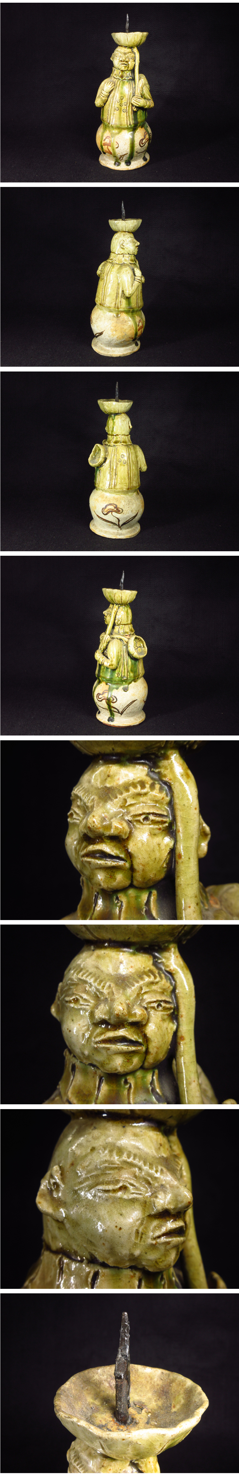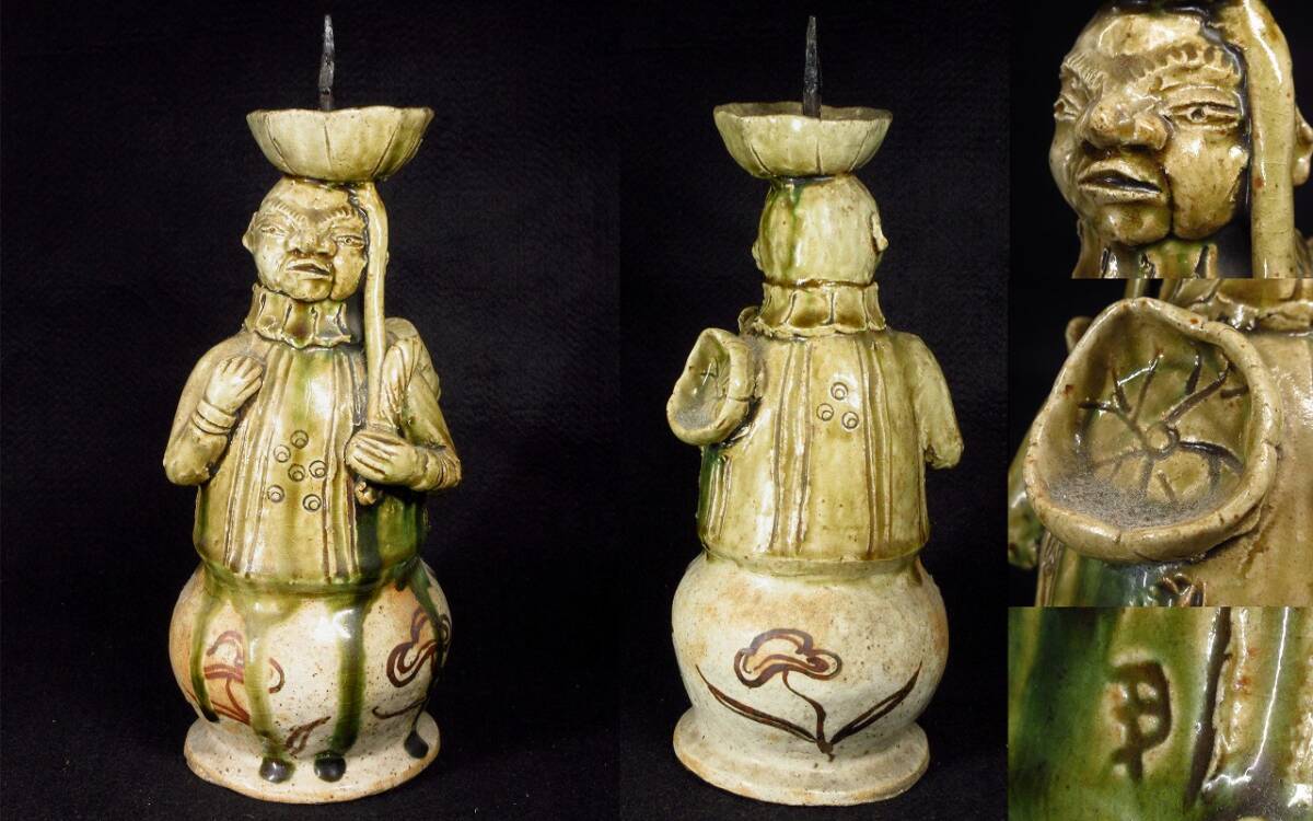 > 【漸】秀逸時代茶道具 織部南蛮人燭台 織部焼 蝋燭立 窯印有 古美術 本物保証【HY2696】