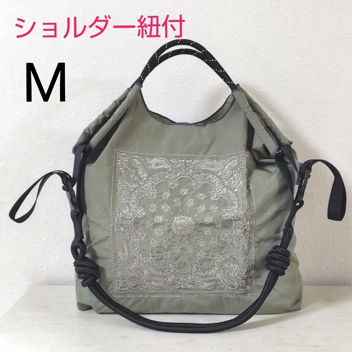 - М ペイズリー バンダナ 刺繍 エコバッグ ストラップ付き トートバッグ カーキ ショルダー