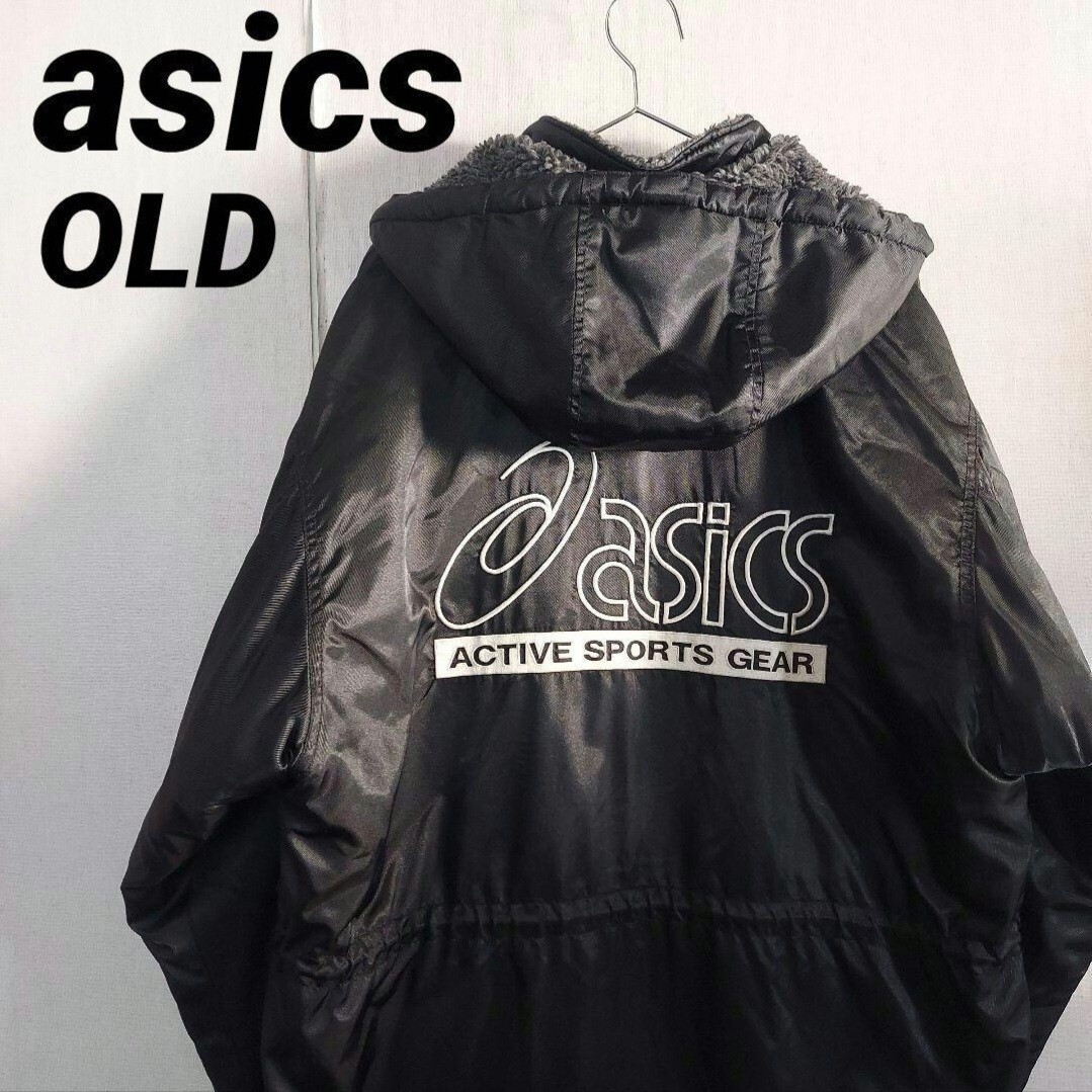 > 古着 アシックス ベンチコート 裏地ボアフリース 刺繍ロゴ フーディー ロング丈 旧ロゴ オールド 90s 00s ブラック asics
