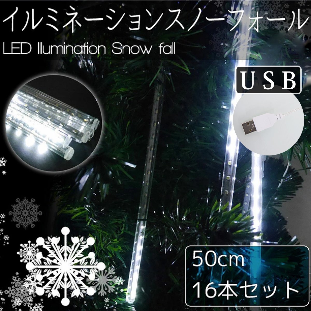 > 【KR-12-2】流れるLEDイルミネーション スノーフォール つらら 50cm 16本セット USB ホワイト お家時間 防水 ベランダ 屋内 屋外 冬