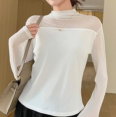 > レディース シースルー ハイネックプルオーバー トップスホワイト白Fサイズ 長袖 カットソー 社交ダンス チュール ストレッチ 透け感