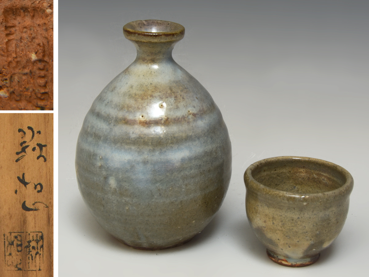 > 石丸萩想 (造) 萩 酒器 / 徳利 ぐい呑 セット / 共箱 しおり 酒盃 杯 猪口 とっくり 茶道具 会席 懐石道具 陶磁器 u1294t