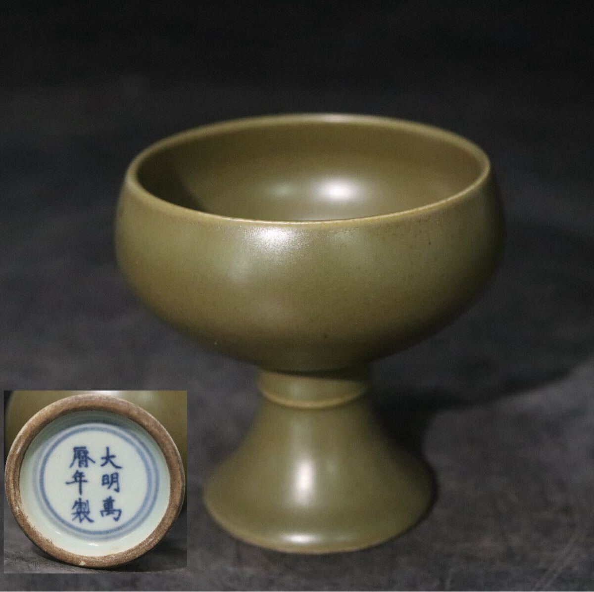 - 大明成化年製 銘 緑釉 蕎麦釉 高足杯 / 中国美術 茶器 煎茶道具 明 成化 酒器 .B1253