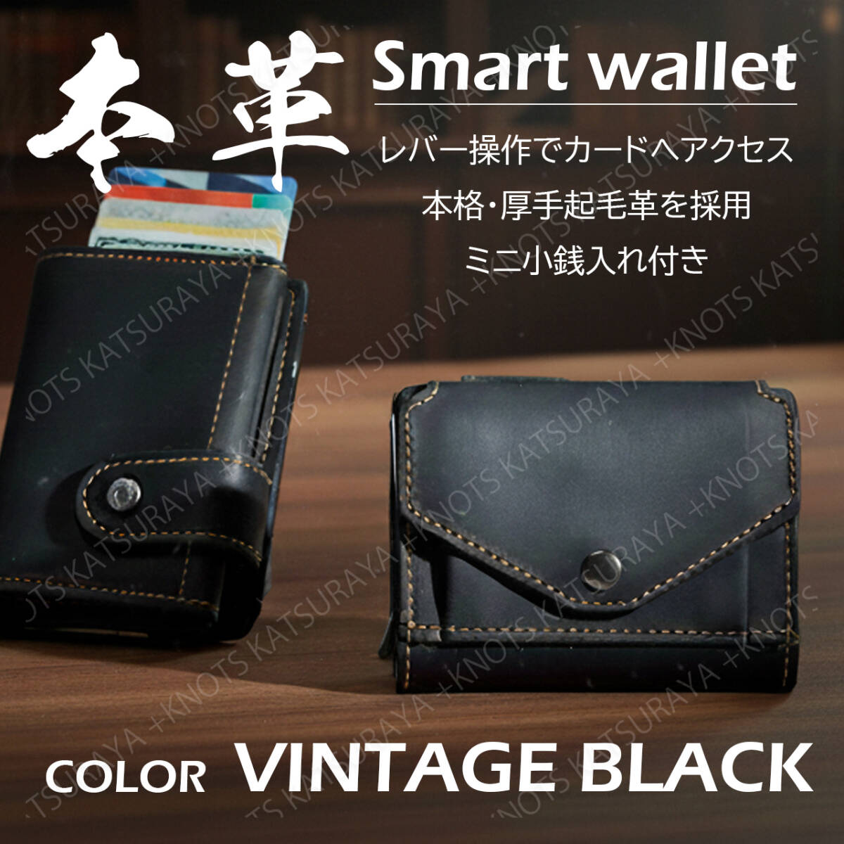 - 本革 スマートウォレット★ブラック黒★メンズ 三つ折り財布 ミニ財布 小さい 小さめ 小型 牛革 レザー スライド式 カード飛び出すa313
