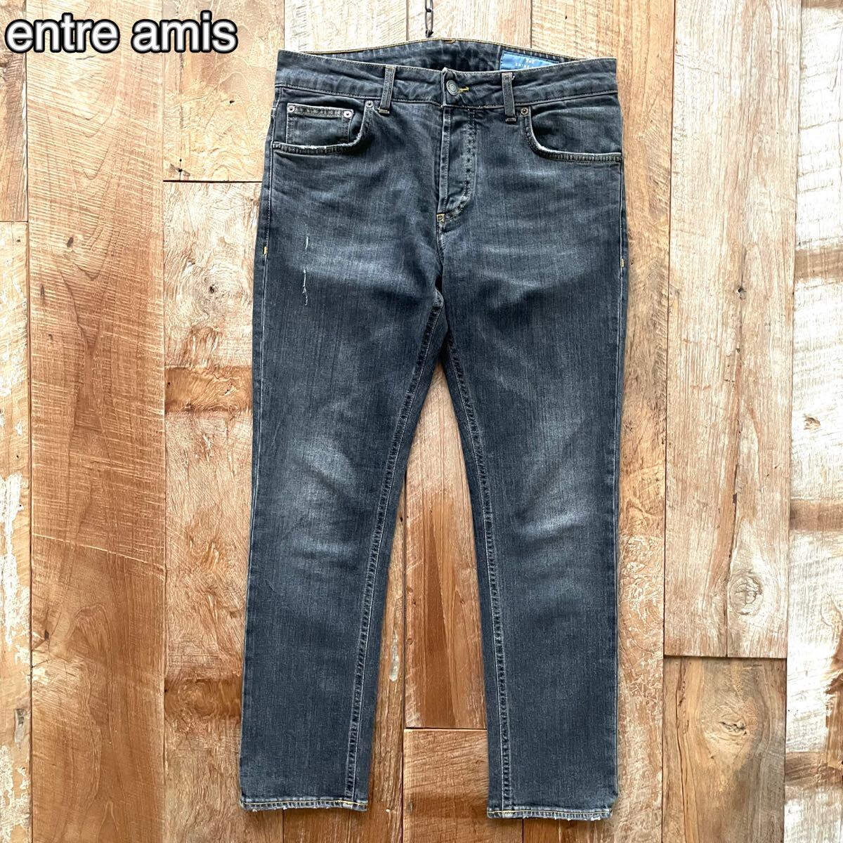 > 【極美品】entre amis アントレアミ ダメージ加工 テーパード ストレッチ デニム パンツ 30 ブラック ストラスブルゴ取扱