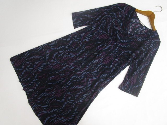 > 美品 ソフール SOFUOL ひざ丈 七分袖 デザインネック シフォンフェイクレイヤードワンピース 3 紺×紫×黒×青 総柄 【メール便可】