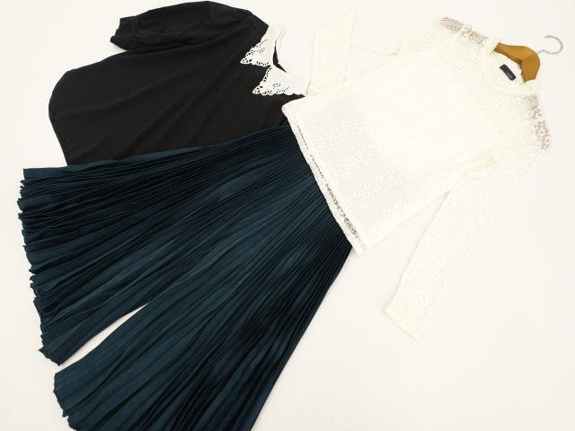 > 美品 a.g. plus等 長袖カットソー+五分袖POブラウス+プリーツスカーチョ コーデ3点セット M 白 花/黒/緑 ガーリー・フェミニン系 20代~