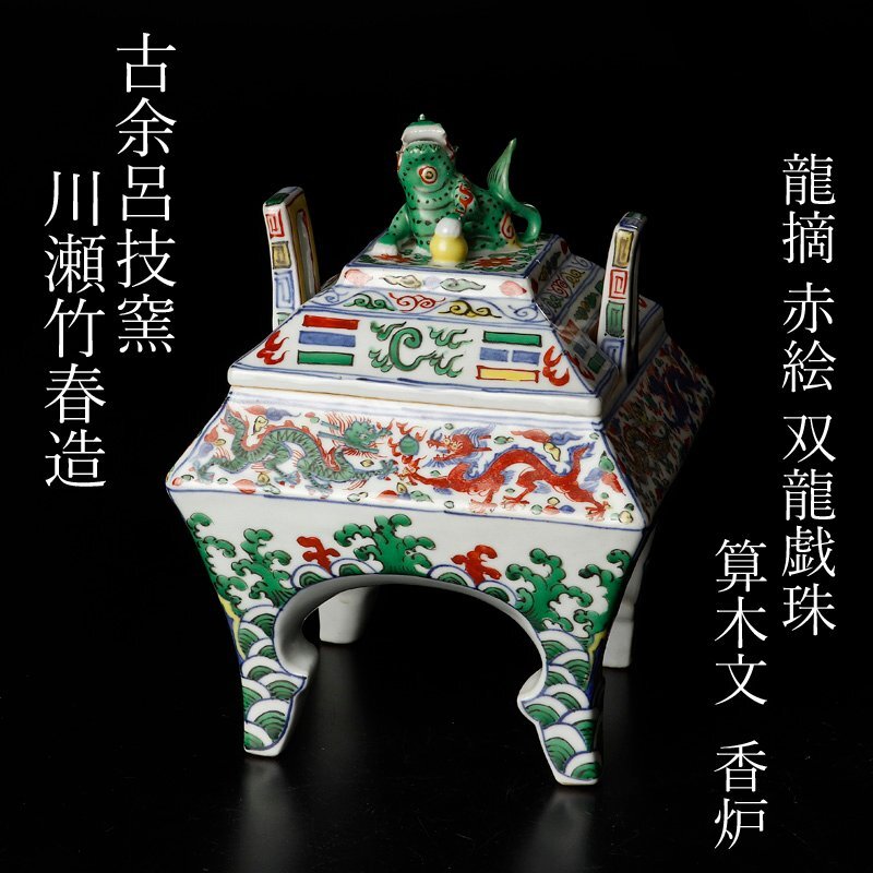 > 【古美味】古余呂技窯 川瀬竹春造 龍摘 赤絵 双龍戯珠 算木文 香炉 茶道具 保証品 XK0v