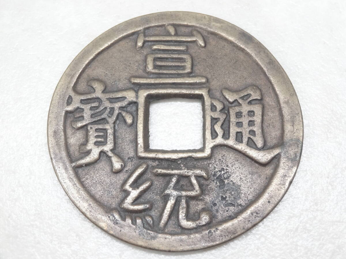 - #44429☆超大型銭☆古銭 穴銭 宣統通寶 裏絵銭 約83.1mm 厚み約3.7mm 重さ約121.5g 激レア 中国古銭 アンティーク 未鑑定 現状品