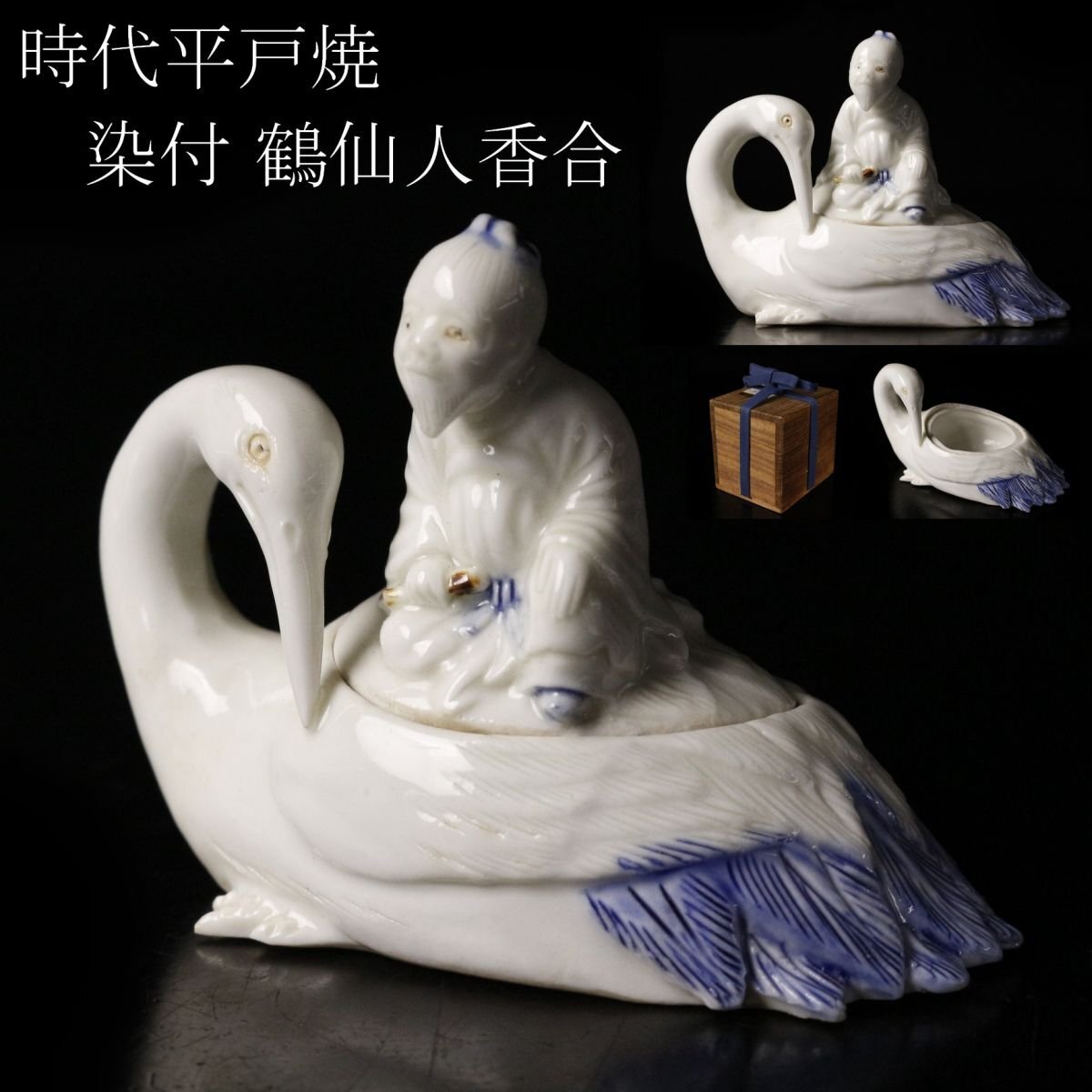 - 【LIG】時代平戸焼 染付 鶴仙人香合 古美術品 時代箱 旧家蔵出品 [.EE]25.6