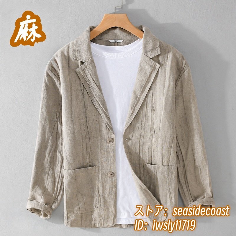 - 夏新品 リネン テーラードジャケット メンズ ブレザー 春夏 コート 最高級 麻スーツ 背広 デザイナーズ シワ感 紳士服 無地 ベージュ 3XL